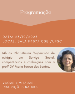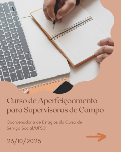 No dia 23/10/20225 das 14h às 17h contaremos com mais uma edição do curso de Aperfeiçoamento para Supervisoras(es) de Campo de Estágio. O encontro será realizado na Sala F407 do CSE/UFSC com a professora Maria Teresa dos Santos que ministrará a oficina “Supervisão de estágio em Serviço Social: competências e atribuições”. As inscrições já podem ser realizadas através da página: https://www.even3.com.br/curso-de-aperfeicoamento-para-supervisores-as-de-estagio-2025-2-633155/.