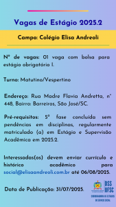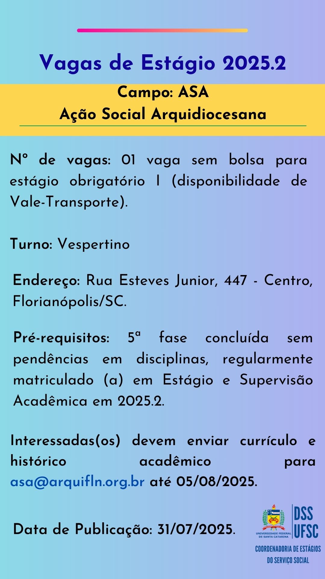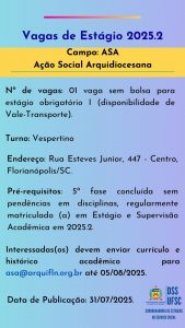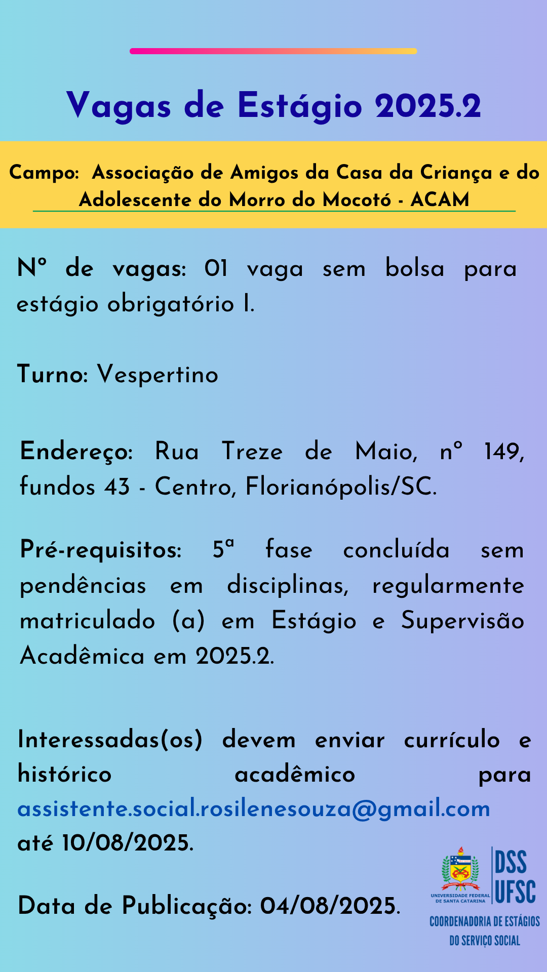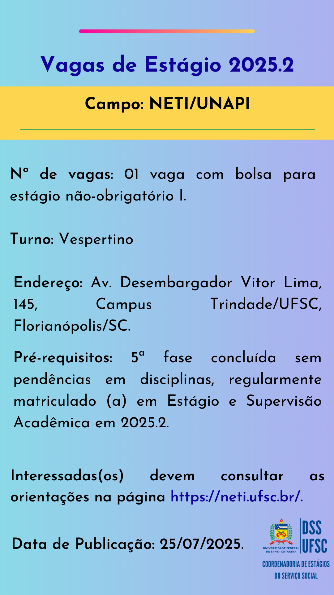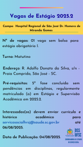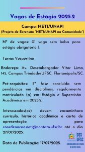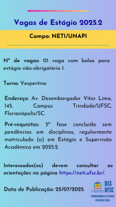Divulgamos abaixo as vagas de estágio para o semestre 2025.2.